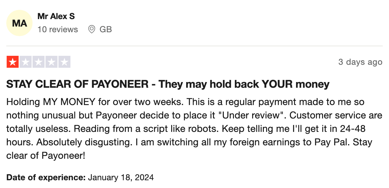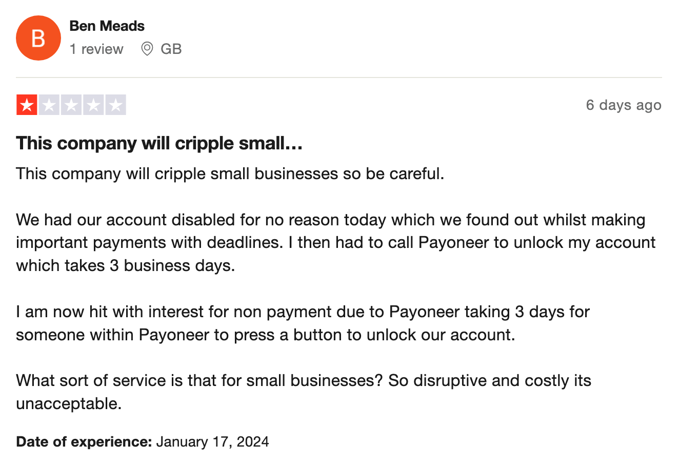 Payoneer has a history of abruptly blocking accounts without notice, leaving users in distress. Reviews on Trustpilot include statements like, "After 6+ years of using, they closed the account without any prior notice, with all my balance and cards."