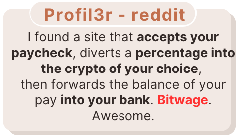 Bitwage is a company that enables individuals and companies to receive all or a portion of their salaries/wages/paychecks in Bitcoin, as well as local fiat currencies. One of the key benefits of Bitwage is that it allows employees to receive their wages in Bitcoin without having to ask for permission from their employer. Get paid in Bitcoin - the future is now.