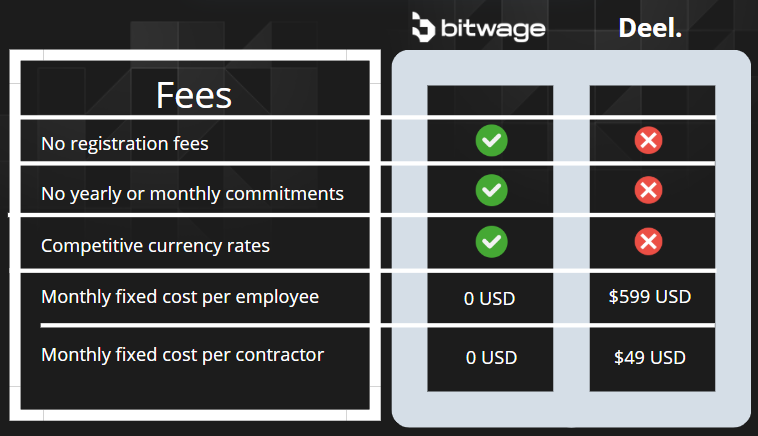 When it comes to fees and pricing, Bitwage and Deel take very different approaches. Bitwage shines with a pay-as-you-go model. There are no registration fees, no monthly subscriptions, and no long-term contracts, you only pay when you use the service. This makes it an incredible option for small businesses that want to take it slow and don't want to pay insane amounts of money before even trying a service. On top of that, Bitwage offers competitive, transparent exchange rates with no hidden markups, ensuring you get the most bang for your buck.