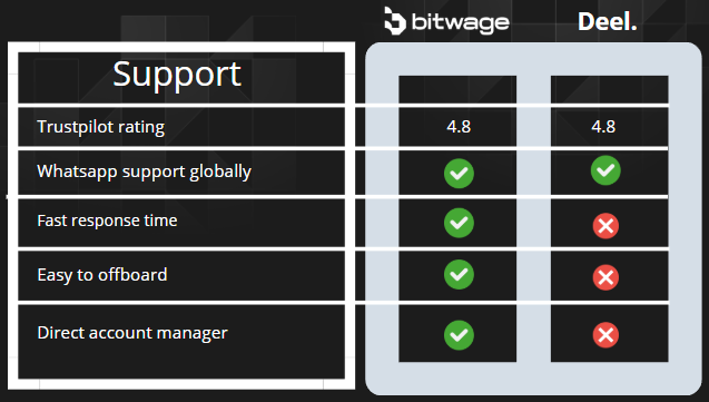 When it comes to customer support, Bitwage goes way above the expectation to make you feel like a priority. Bitwage offers 24/7 global support directly via Whatsapp, along with direct access to a dedicated account manager to make sure you always have someone to turn to. These support agents are also real people, not a generic chatbot telling you that it's your mistake and no one can help you. Even if you decide to stop using Bitwage, our support agents will make your offboarding experience so unique that you'll miss it.
