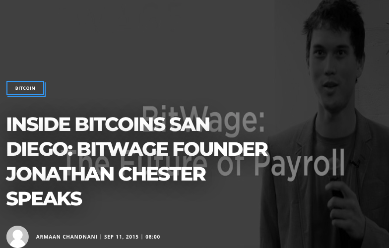 (Bitcoinist) INSIDE BITCOINS SAN DIEGO: BITWAGE FOUNDER JONATHAN CHESTER SPEAKS Paid Members Public