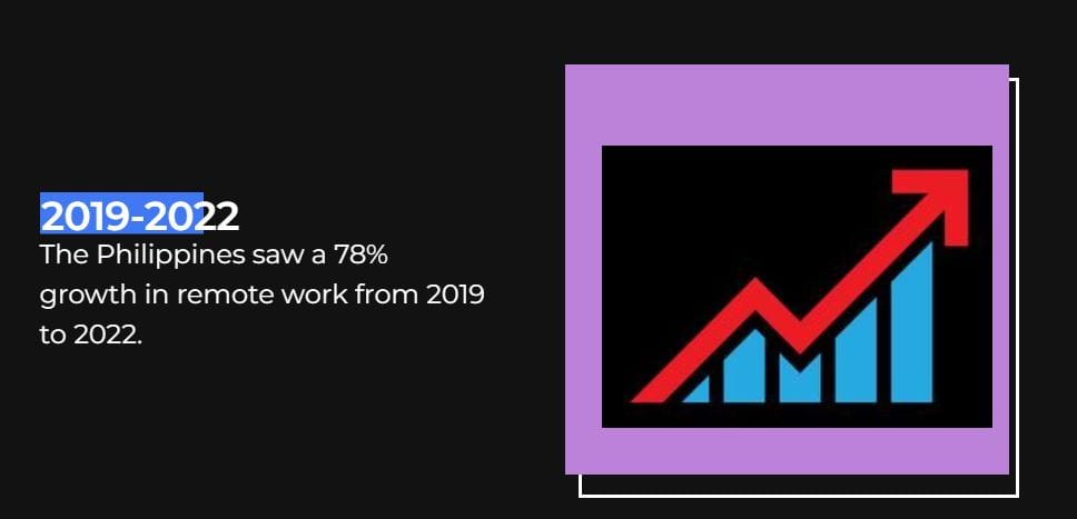 The Philippines are amongst the largest growing countries in terms of remote work. According to the WEF(World Economic Forum) the Philippines is ranked number 7 in terms of growth over the past few years, while in 2023 alone the growth was a whopping 60% on its own.